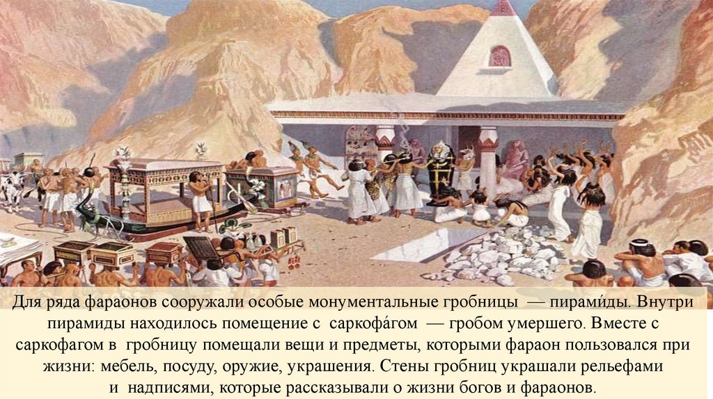Для ряда фараонов сооружали особые монументальные гробницы — пирами́ды. Внутрипирамиды находилось помещение с саркофа́гом — гробом умершего. Вместе с