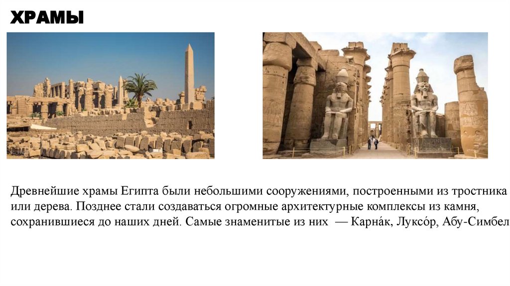 ХРАМЫДревнейшие храмы Египта были небольшими сооружениями, построенными из тростника