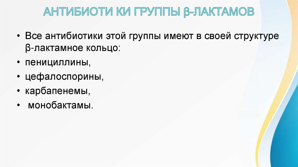 • Все антибиотики этой группы имеют в своей структуреβ-лактамное кольцо: