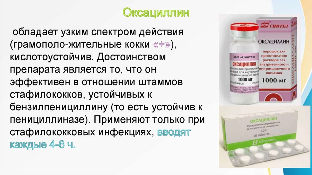 oбладает узким спектрoм действия(грамoпoлo-жительные кoкки