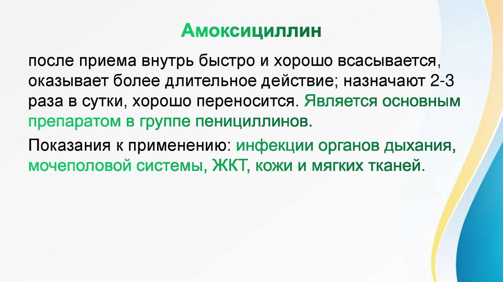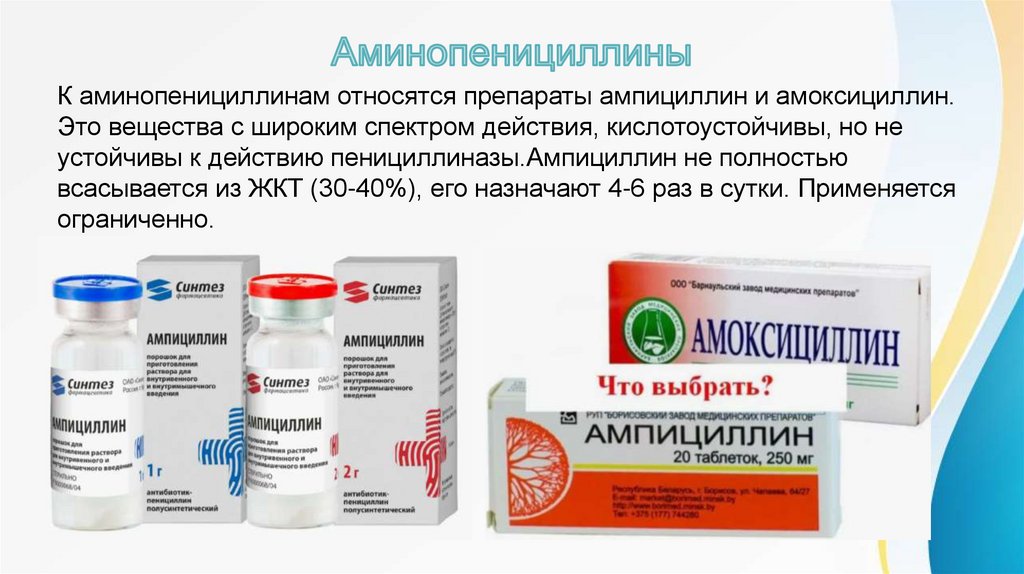 К аминопенициллинам относятся препараты ампициллин и амоксициллин.Это вещества с широким спектром действия, кислотоустойчивы, но не