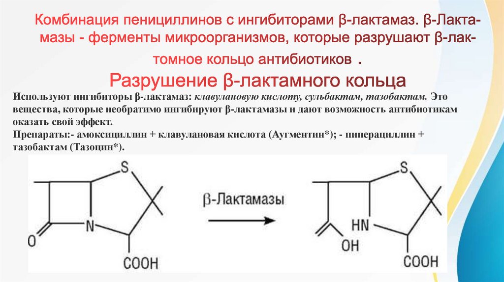 Используют ингибиторы β-лактамаз: клавулановую кислоту, сульбактам, тазобактам. Этовещества, которые необратимо ингибируют β-лактамазы и дают возможность антибиотикам