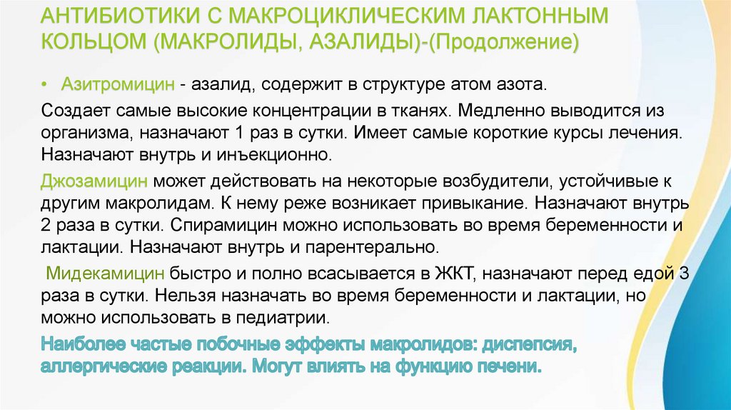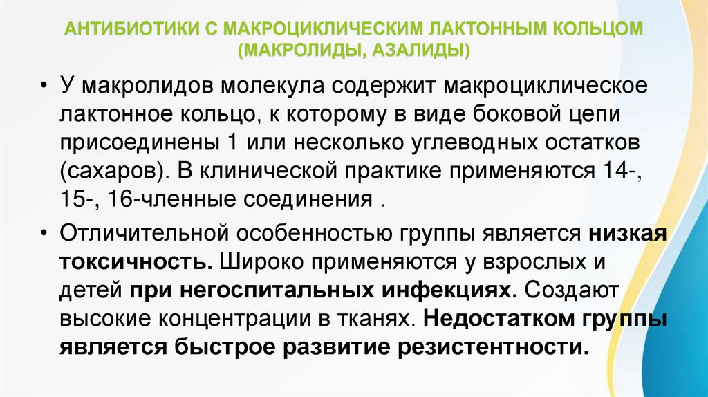 АНТИБИОТИКИ С МАКРОЦИКЛИЧЕСКИМ ЛАКТОННЫМ КОЛЬЦОМ(МАКРОЛИДЫ, АЗАЛИДЫ)