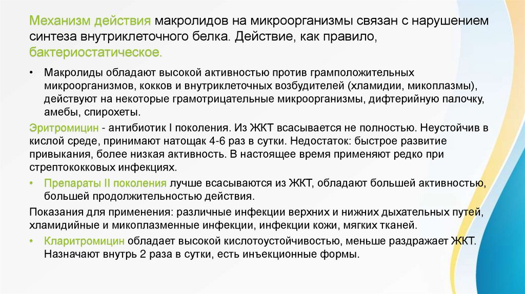 Механизм действия макролидов на микроорганизмы связан с нарушениемсинтеза внутриклеточного белка. Действие, как правило,