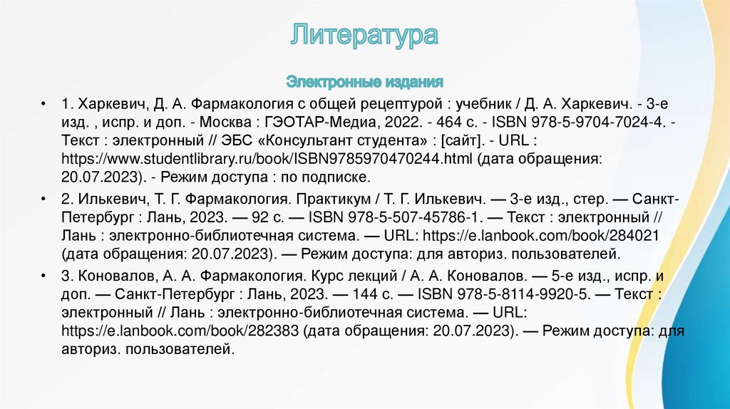 • 1. Харкевич, Д. А. Фармакология с общей рецептурой : учебник / Д. А. Харкевич. - 3-еизд. , испр. и доп. - Москва : ГЭОТАР-Медиа, 2022. - 464 с. - ISBN 978-5-9704-7024-4. Текст : электронный // ЭБС «Консультант студента» : [сайт]. - URL :