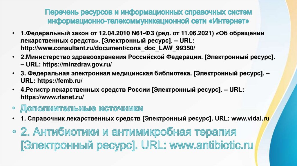 • 1.Федеральный закон от 12.04.2010 N61-ФЗ (ред. от 11.06.2021) «Об обращениилекарственных средств». [Электронный ресурс]. – URL: