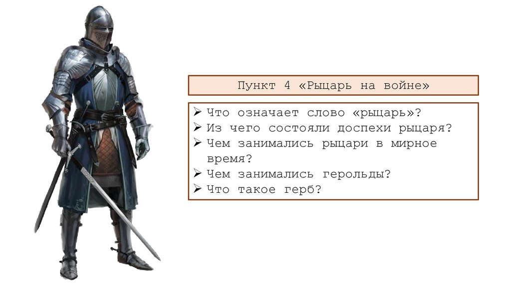 Пункт 4 «Рыцарь на войне»Что означает слово «рыцарь»?