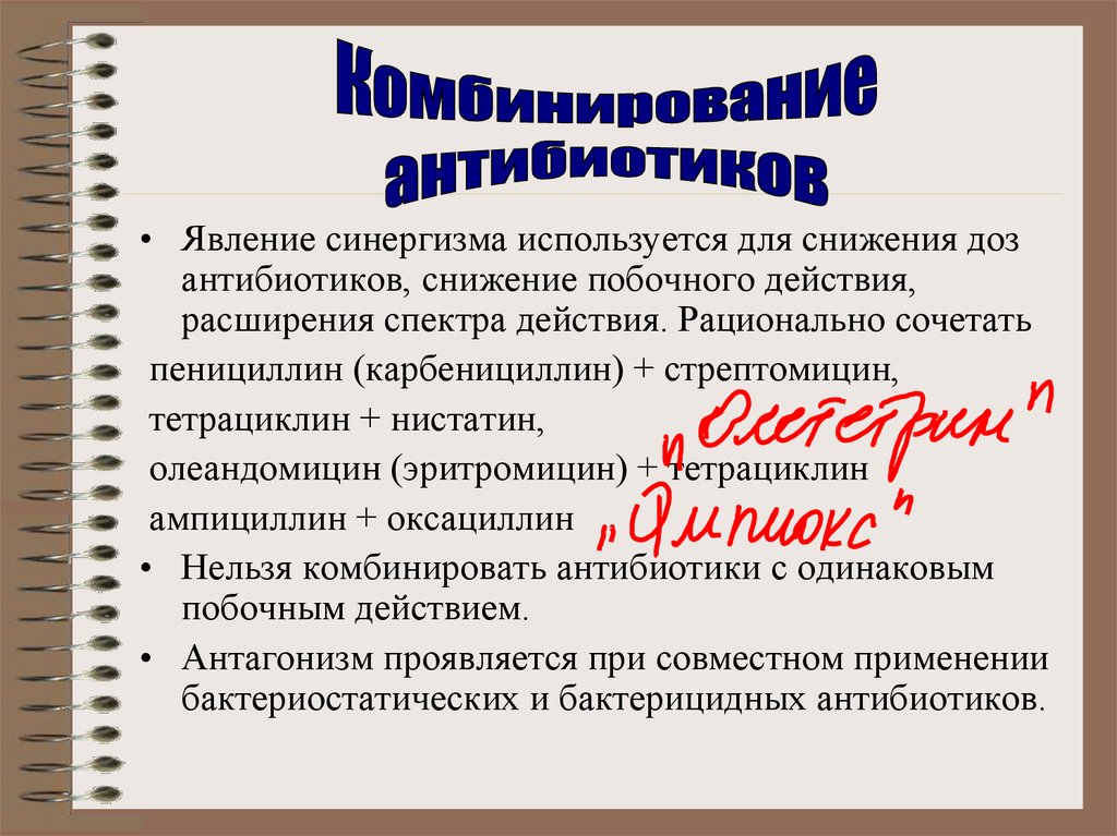 • Явление синергизма используется для снижения дозантибиотиков, снижение побочного действия,