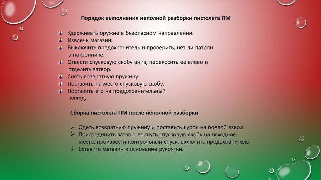Порядок выполнения неполной разборки пистолета ПМУдерживать оружие в безопасном направлении.