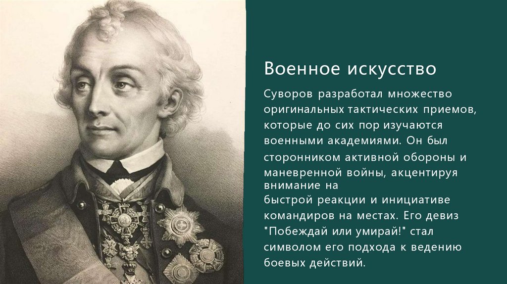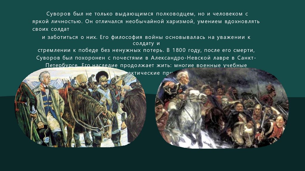 Суворов был не только выдающимся полководцем, но и человеком сяркой личностью. Он отличался необычайной харизмой, умением вдохновлять