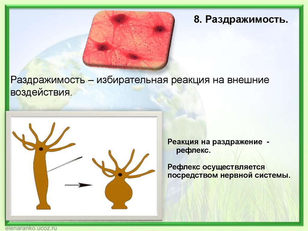 8. Раздражимость.Раздражимость – избирательная реакция на внешние