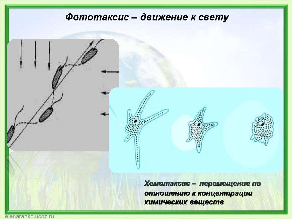 Фототаксис – движение к светуХемотаксис – перемещение по