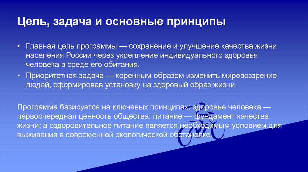 Цель, задача и основные принципы• Главная цель программы — сохранение и улучшение качества жизни