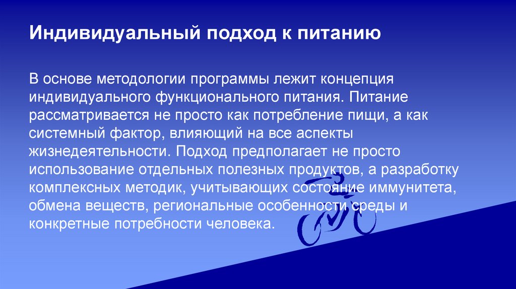 Индивидуальный подход к питаниюВ основе методологии программы лежит концепция