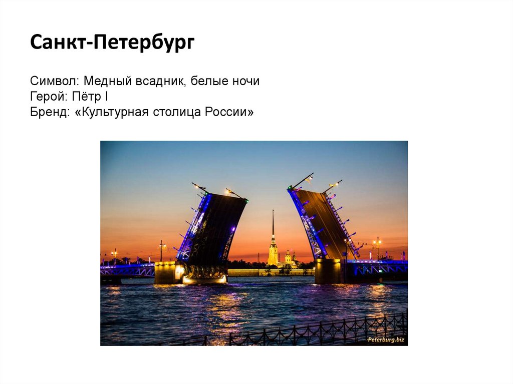Санкт-ПетербургСимвол: Медный всадник, белые ночи
