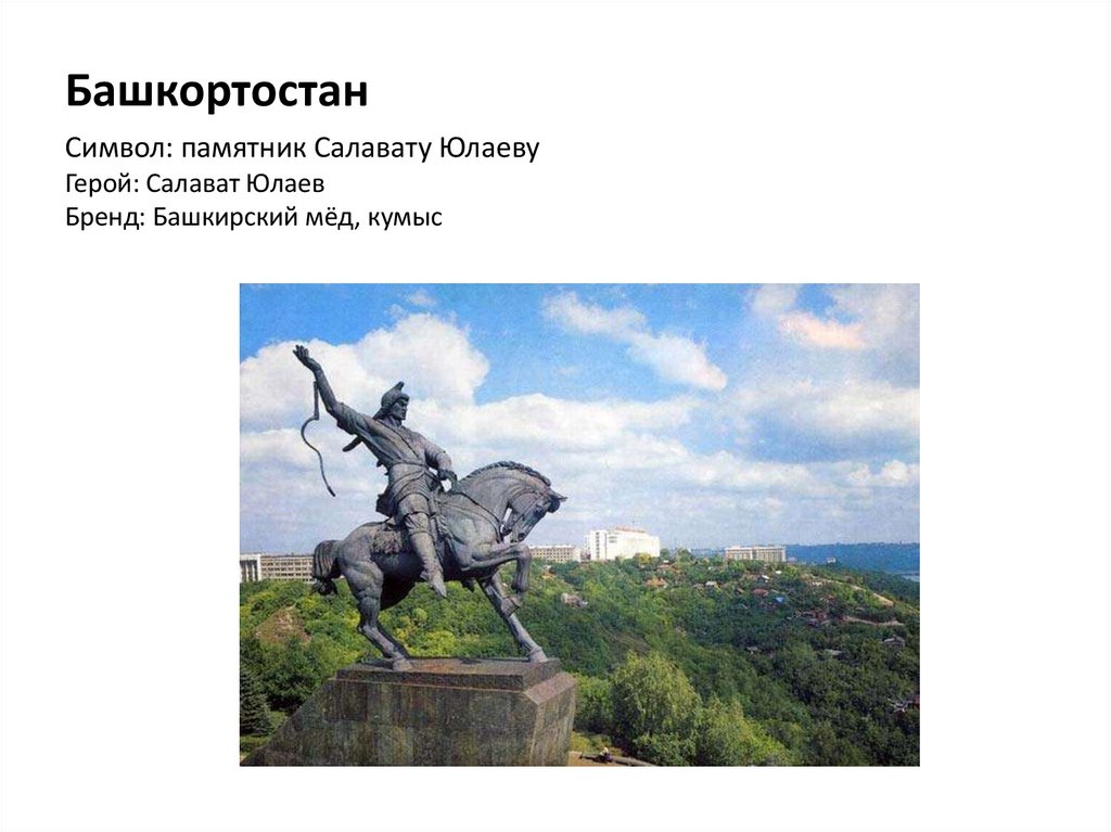 БашкортостанСимвол: памятник Салавату Юлаеву