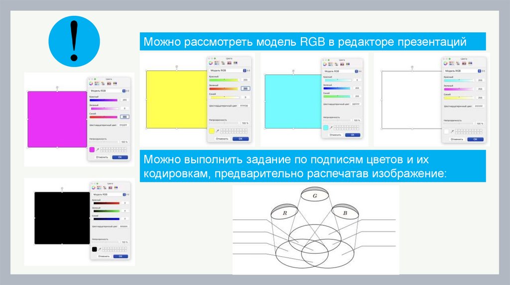 Можно рассмотреть модель RGB в редакторе презентацийМожно выполнить задание по подписям цветов и их