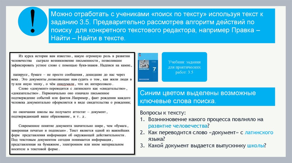 Можно отработать с учениками «поиск по тексту» используя текст кзаданию 3.5. Предварительно рассмотрев алгоритм действий по