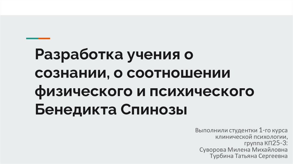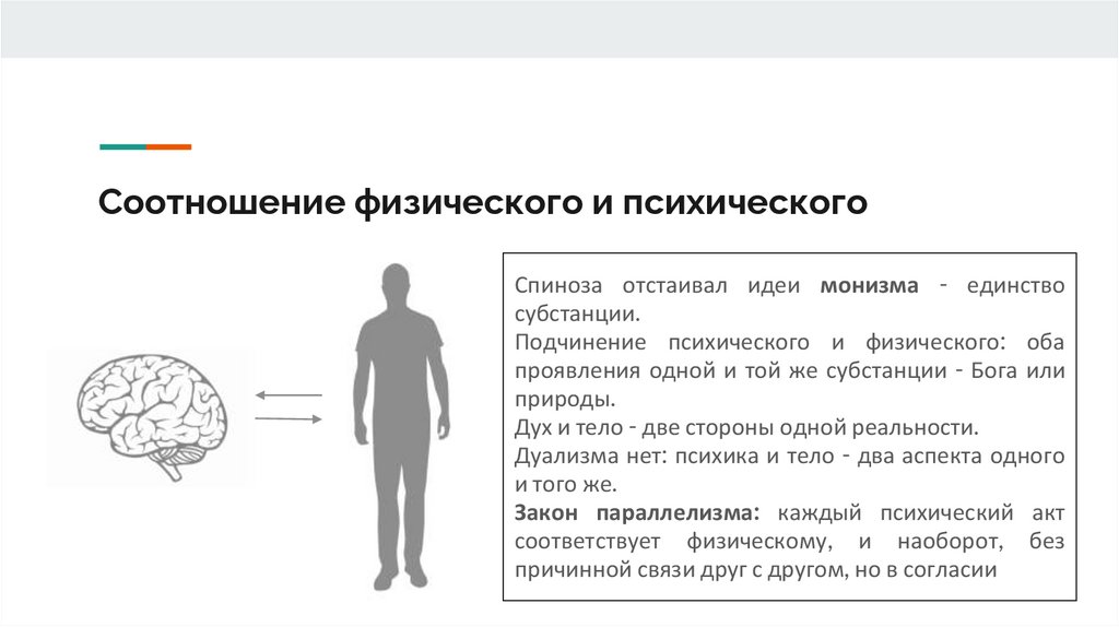 Соотношение физического и психическогоСпиноза отстаивал идеи монизма - единство