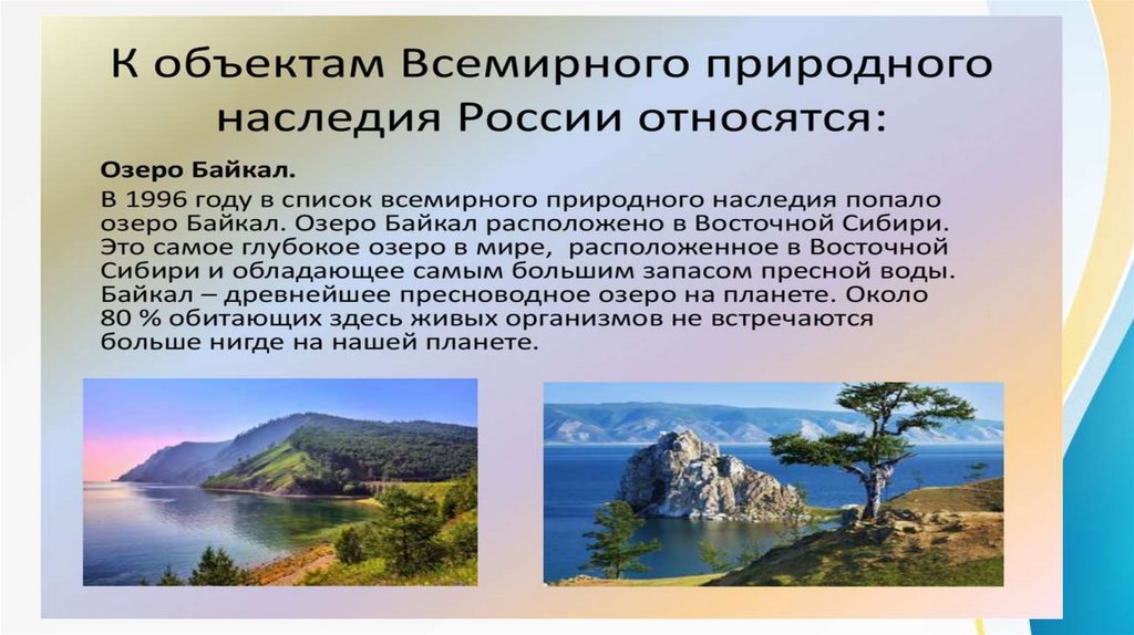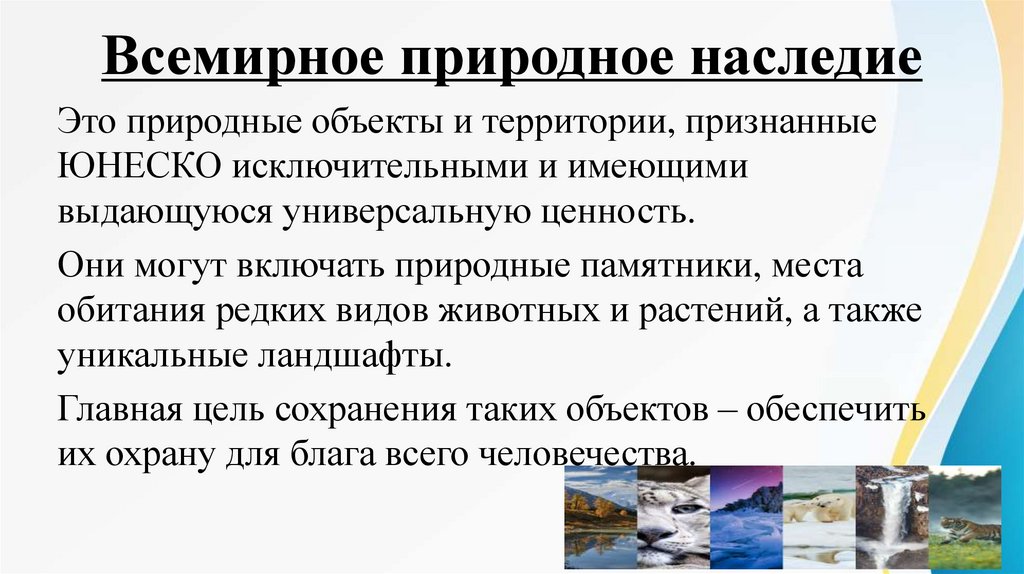 Всемирное природное наследиеЭто природные объекты и территории, признанные
