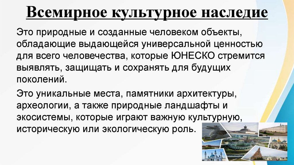 Всемирное культурное наследиеЭто природные и созданные человеком объекты,
