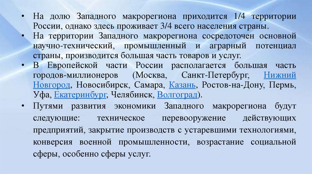 • На долю Западного макрорегиона приходится 1/4 территорииРоссии, однако здесь проживает 3/4 всего населения страны.