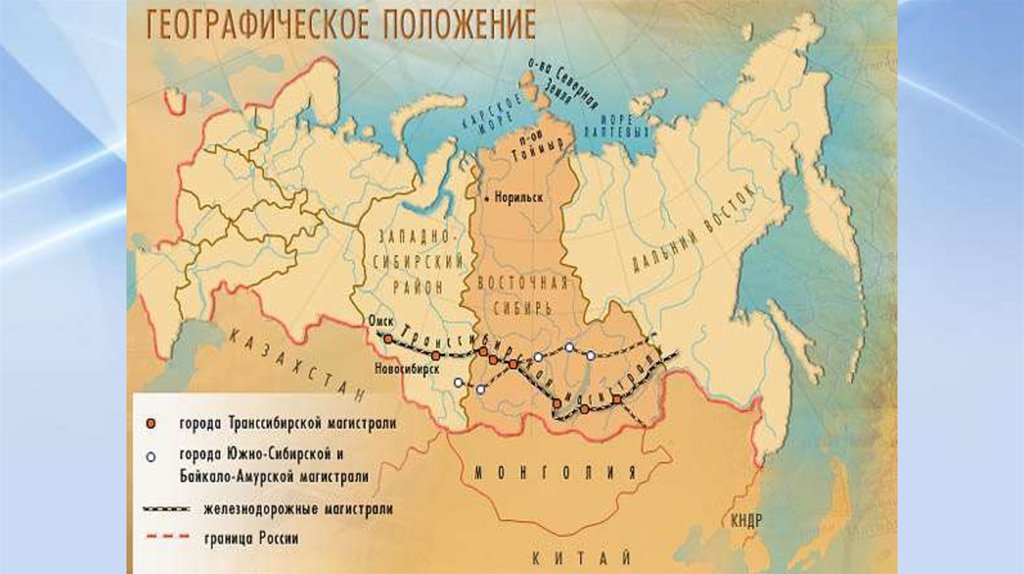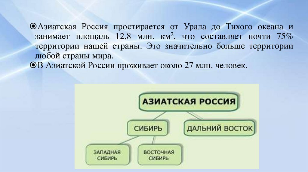 Азиатская Россия простирается от Урала до Тихого океана изанимает площадь 12,8 млн. км2, что составляет почти 75%