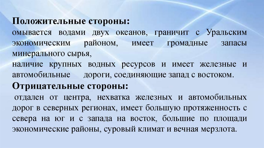 Положительные стороны:омывается водами двух океанов, граничит с Уральским