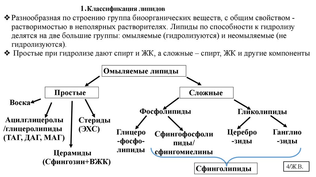 1.Классификация липидов❖ Разнообразная по строению группа биоорганических веществ, с общим свойством растворимостью в неполярных растворителях. Липиды по способности к гидролизу