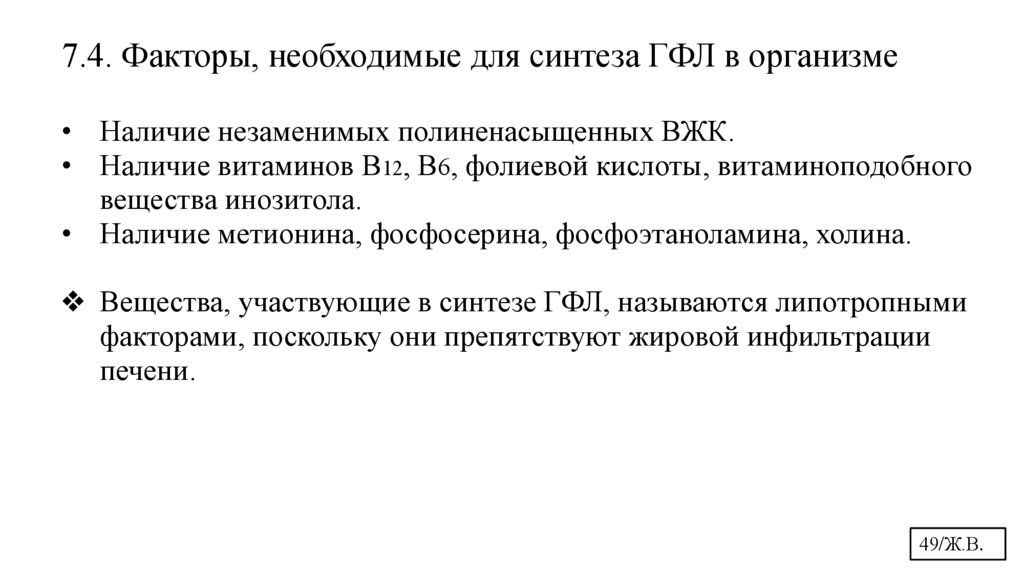 7.4. Факторы, необходимые для синтеза ГФЛ в организме• Наличие незаменимых полиненасыщенных ВЖК.