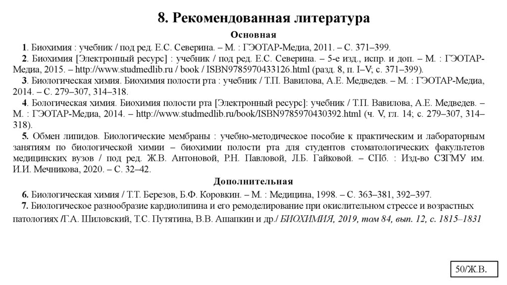 1. Биохимия : учебник / под ред. Е.С. Северина. – М. : ГЭОТАР-Медиа, 2011. – С. 371–399.