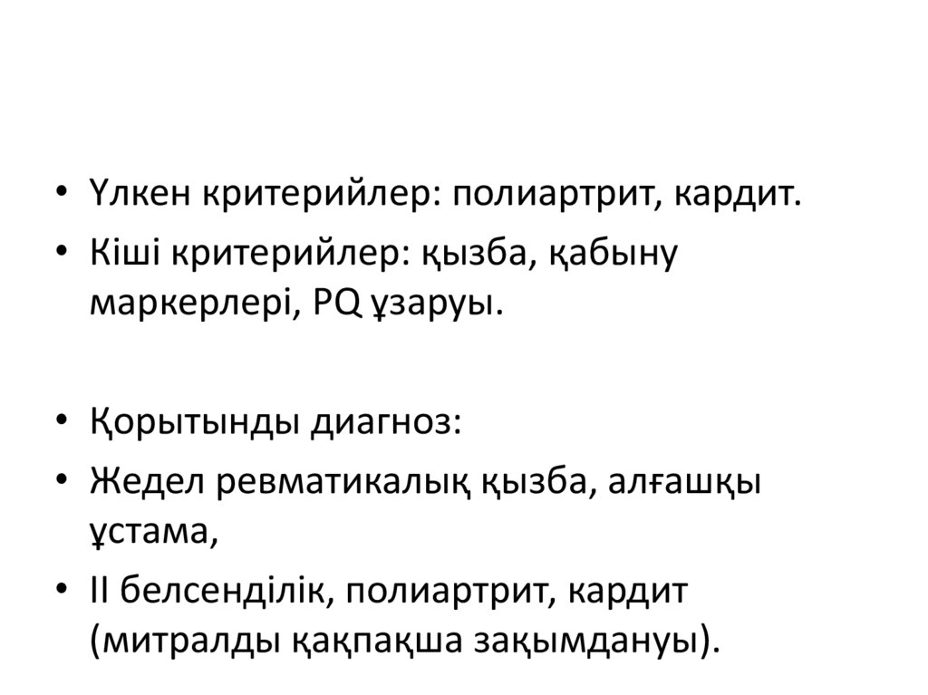• Үлкен критерийлер: полиартрит, кардит.• Кіші критерийлер: қызба, қабыну