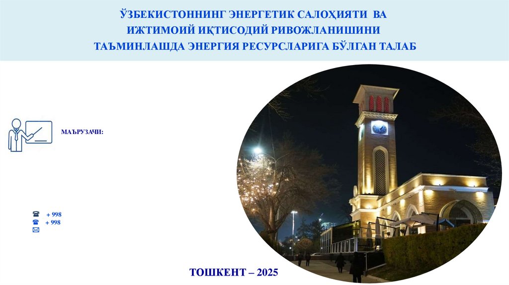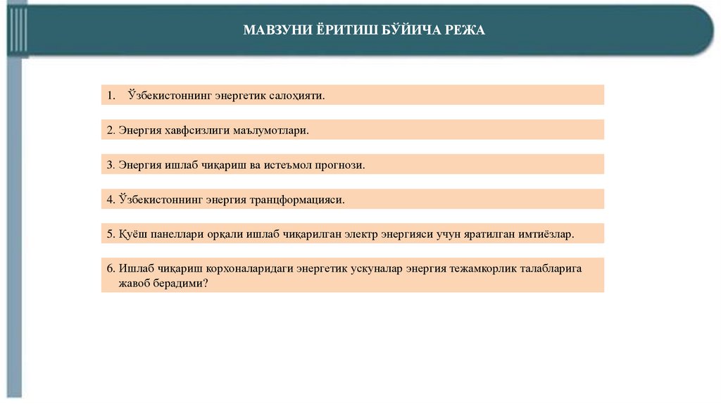 МАВЗУНИ ЁРИТИШ БЎЙИЧА РЕЖА1. Ўзбекистоннинг энергетик салоҳияти.