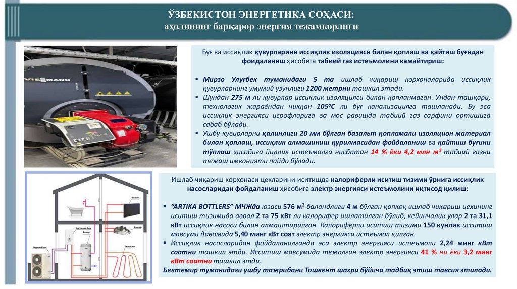 кВт иссиқлик насоси билан алмаштирилган. Калориферли иситиш тизими 150 кунлик исситиш