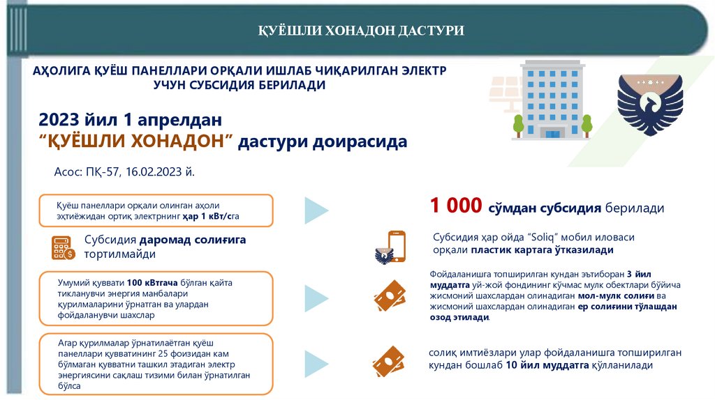 ҚУЁШЛИ ХОНАДОН ДАСТУРИАҲОЛИГА ҚУЁШ ПАНEЛЛАРИ ОРҚАЛИ ИШЛАБ ЧИҚАРИЛГАН ЭЛЕКТР