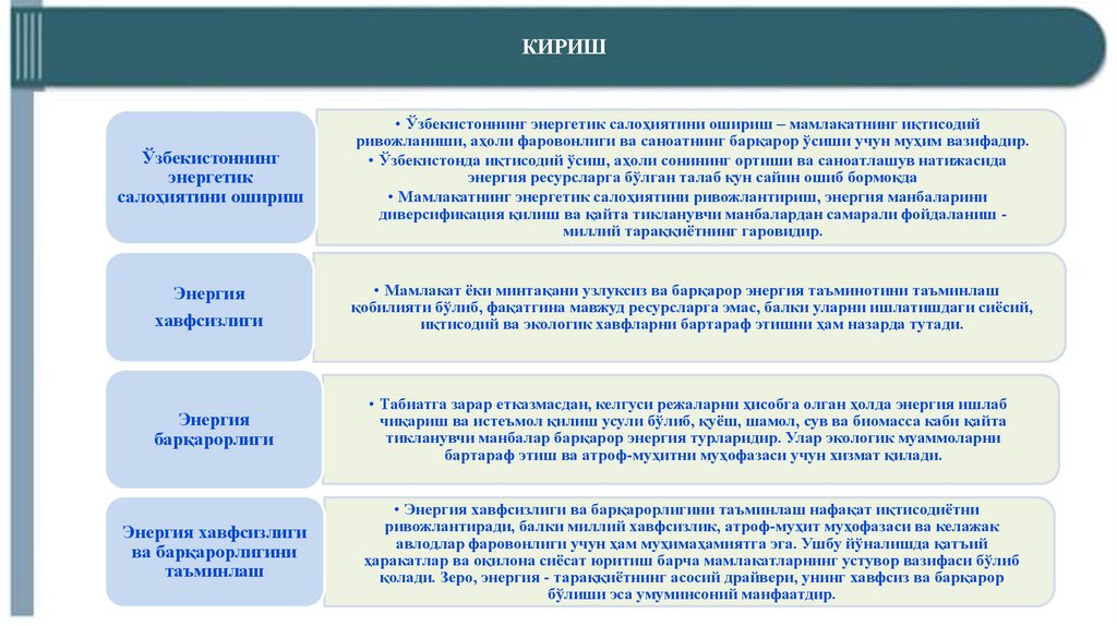 • Энергия хавфсизлиги ва барқарорлигини таъминлаш нафақат иқтисодиётни