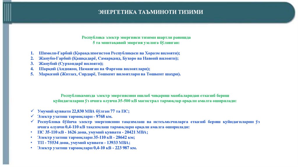 ЭНЕРГЕТИКА ТАЪМИНОТИ ТИЗИМИРеспублика электр энергияси тизими шартли равишда