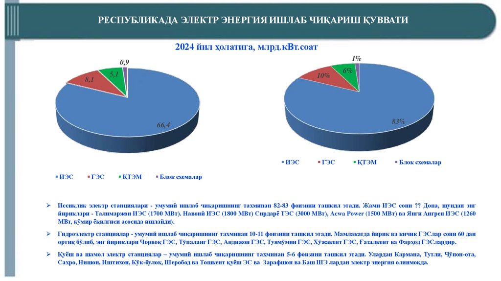 Иссиқлик электр станциялари - умумий ишлаб чиқаришнинг тахминан 82-83 фоизини ташкил этади. Жами ИЭС сони ?? Дона, шундан энг