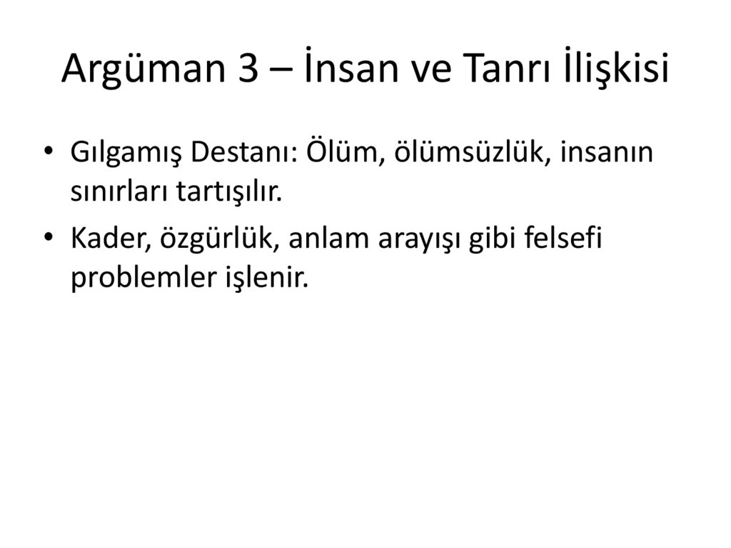 Argüman 3 – İnsan ve Tanrı İlişkisi• Gılgamış Destanı: Ölüm, ölümsüzlük, insanın