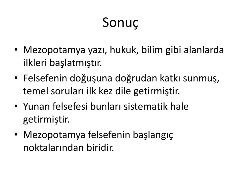 Sonuç• Mezopotamya yazı, hukuk, bilim gibi alanlarda