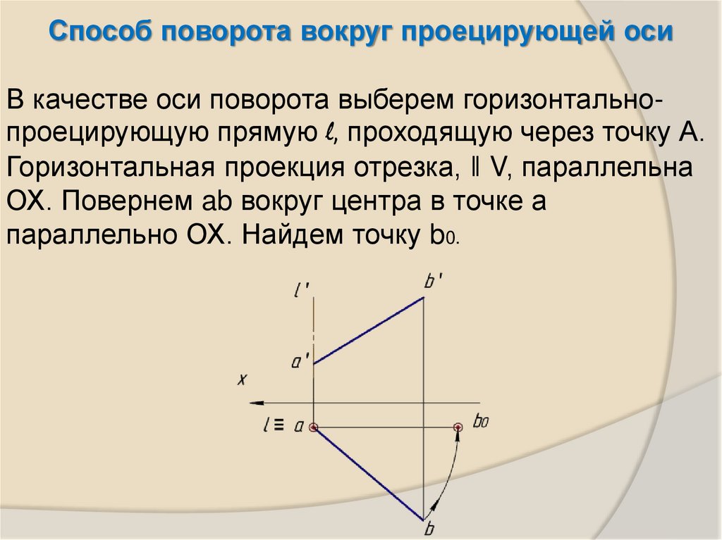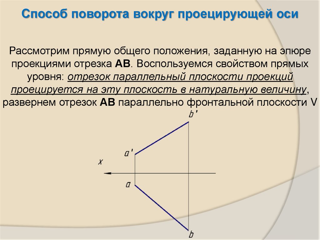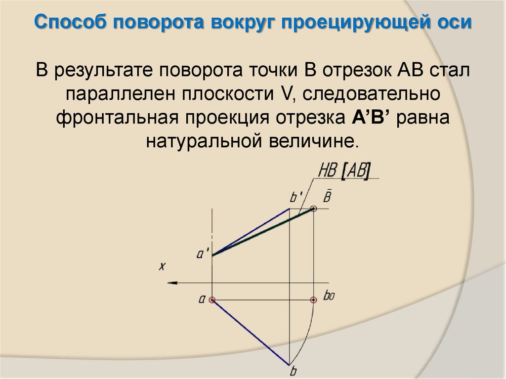 Способ поворота вокруг проецирующей осиВ результате поворота точки В отрезок АВ стал