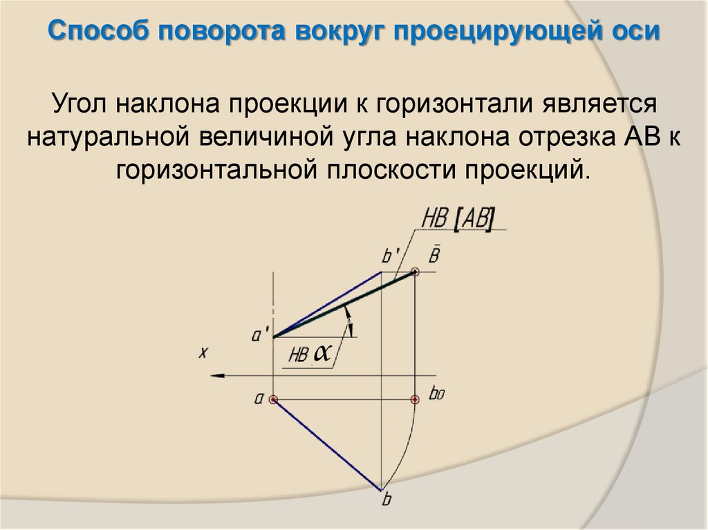 Способ поворота вокруг проецирующей осиУгол наклона проекции к горизонтали является