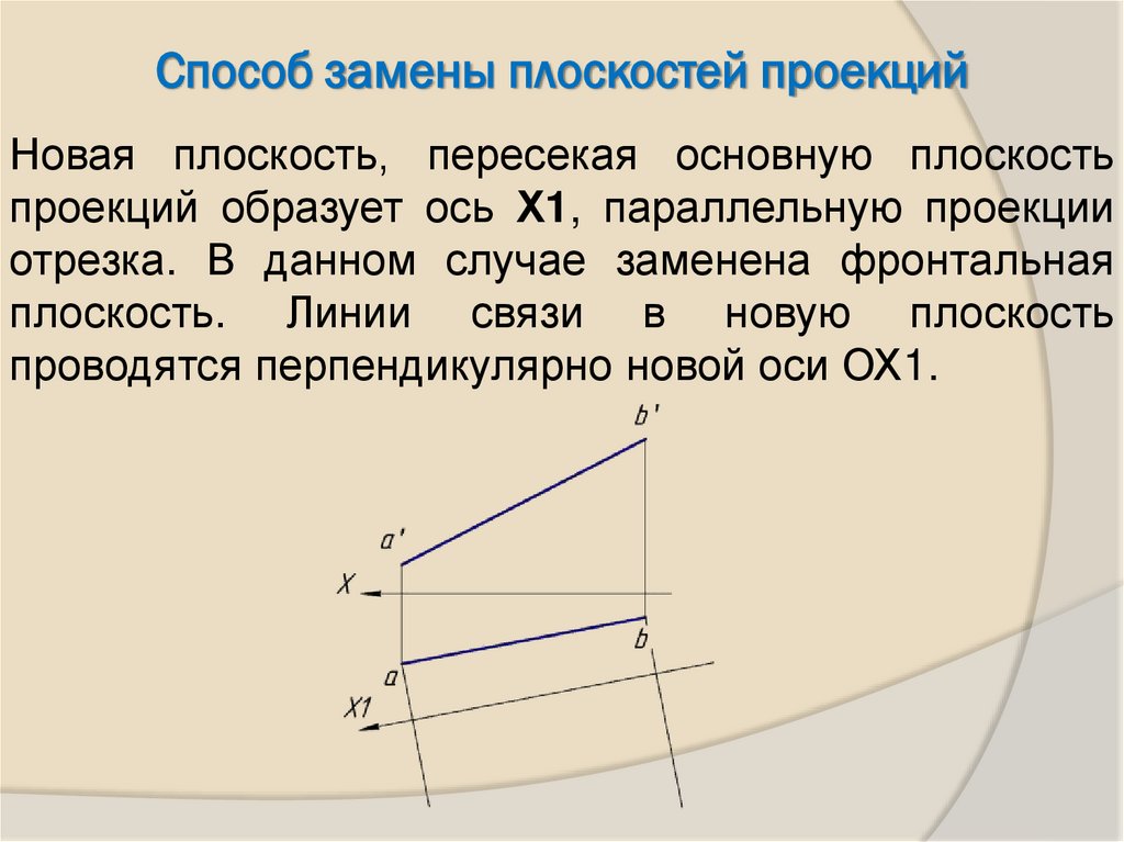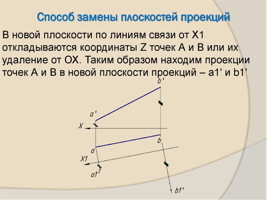- Вводим новую плоскость Н1 (х1II a’b’)26. Проецируем отрезок АВ на плоскость Н1