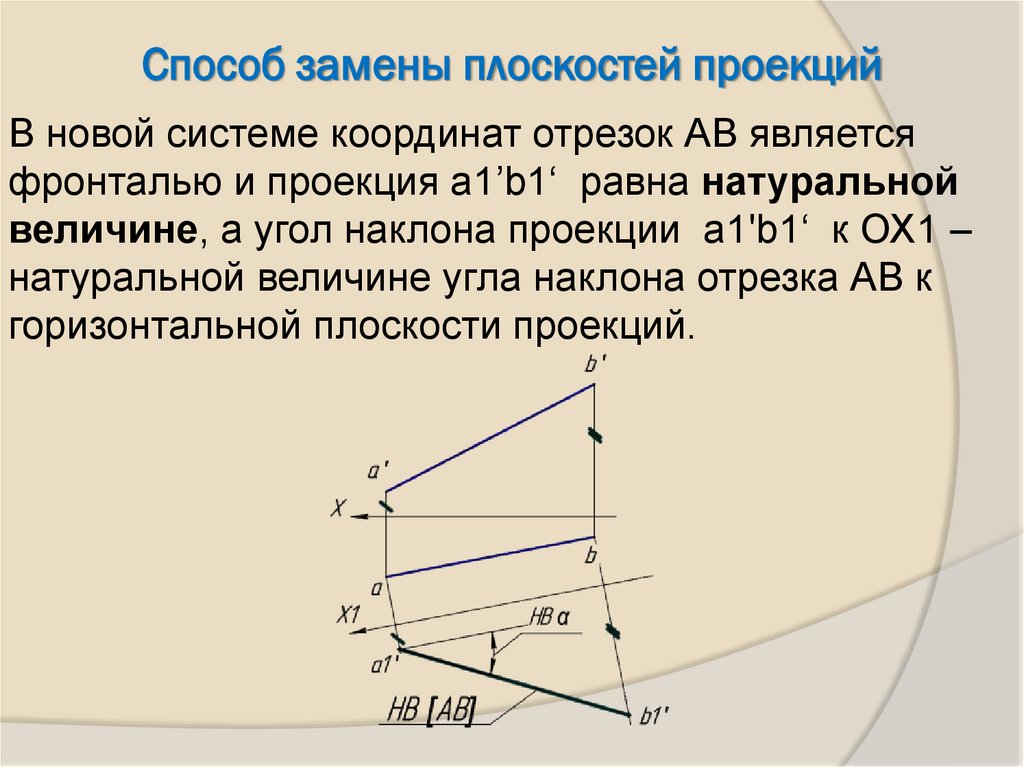 Способ замены плоскостей проекцийВ новой системе координат отрезок АВ является