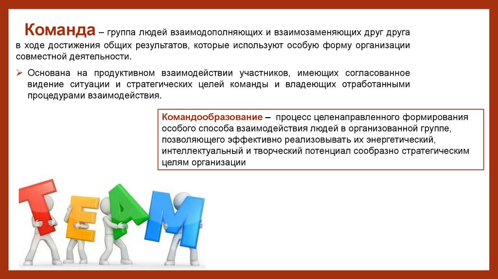 Команда – группа людей взаимодополняющих и взаимозаменяющих друг другав ходе достижения общих результатов, которые используют особую форму организации
