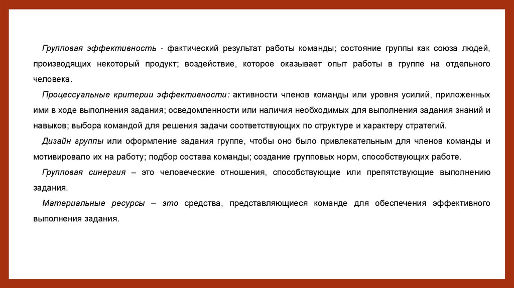 Групповая эффективность - фактический результат работы команды; состояние группы как союза людей,производящих некоторый продукт; воздействие, которое оказывает опыт работы в группе на отдельного