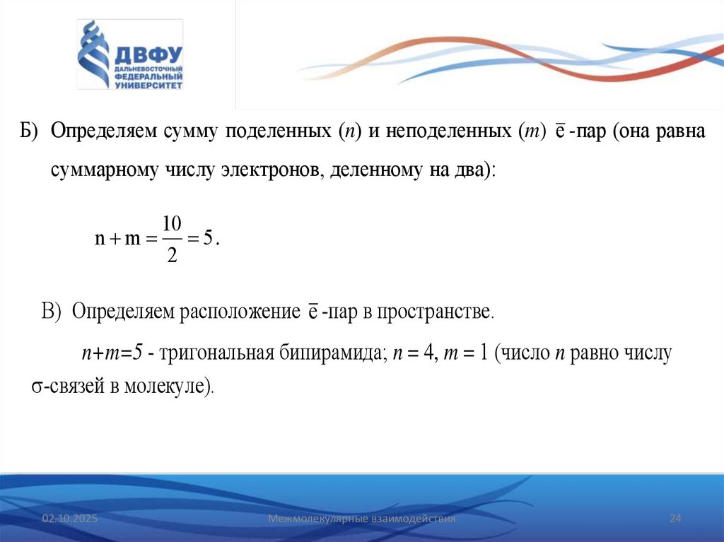 Б) Определяем сумму поделенных (n) и неподеленных (m) e -пар (она равнасуммарному числу электронов, деленному на два):
