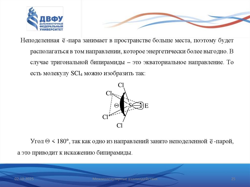 Неподеленная e -пара занимает в пространстве больше места, поэтому будетрасполагаться в том направлении, которое энергетически более выгодно. В
