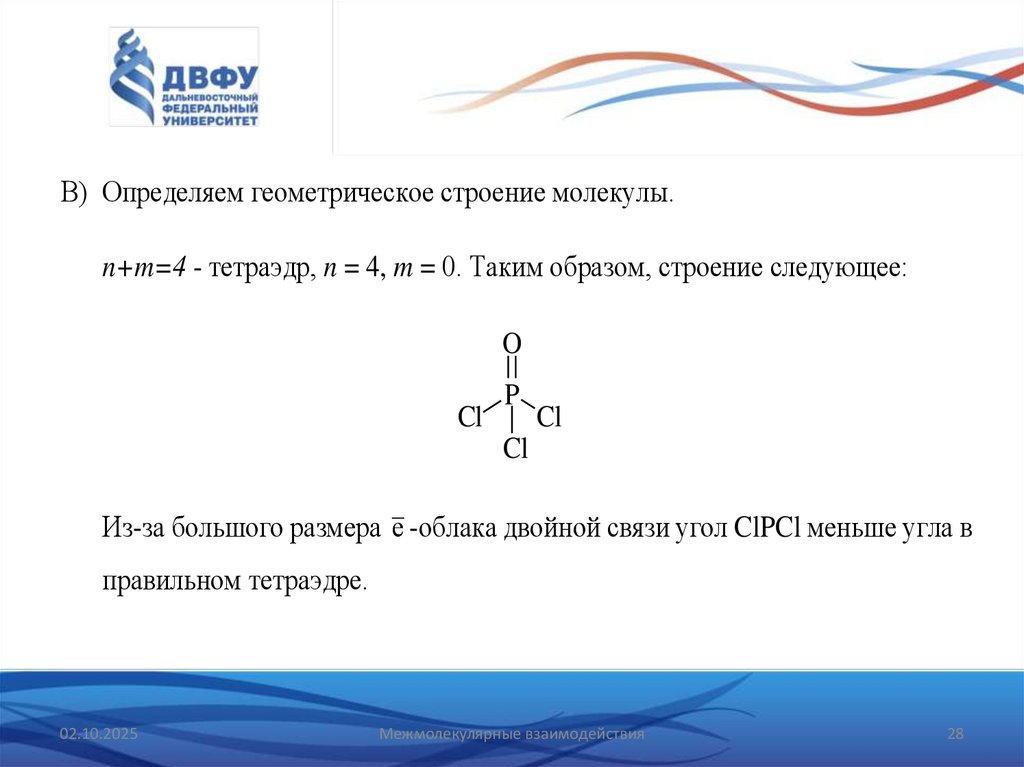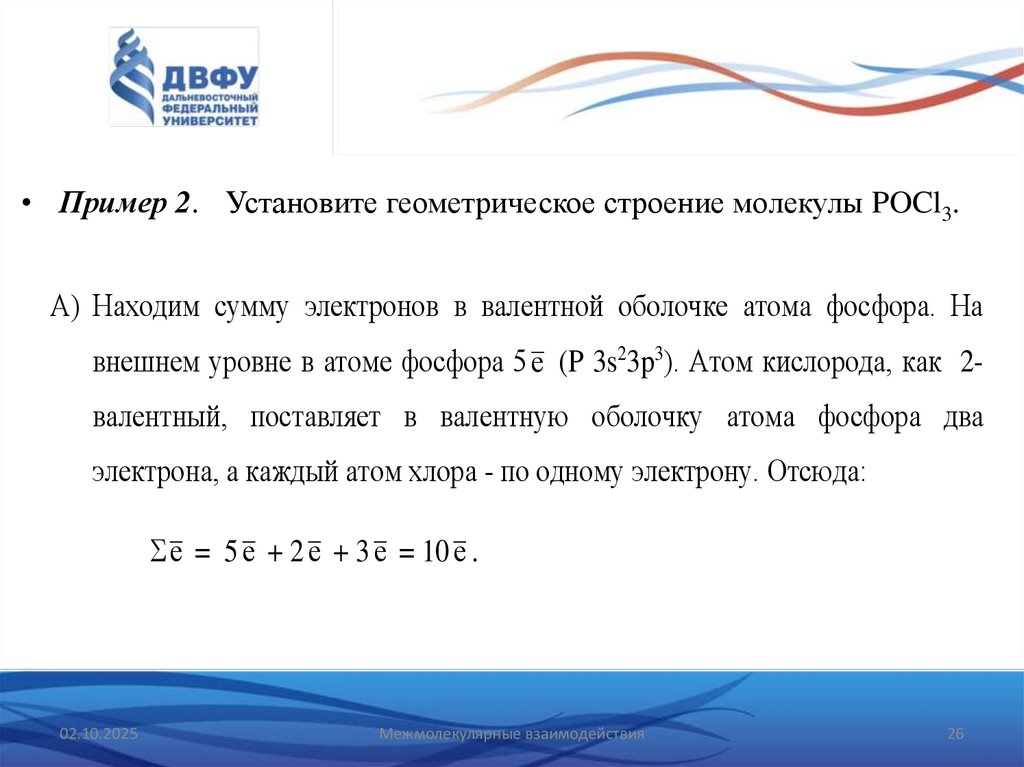 • Пример 2. Установите геометрическое строение молекулы POCl3.А) Находим сумму электронов в валентной оболочке атома фосфора. На