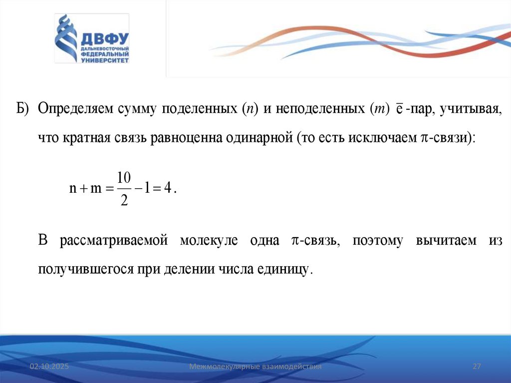 Б) Определяем сумму поделенных (n) и неподеленных (m) e -пар, учитывая,что кратная связь равноценна одинарной (то есть исключаем -связи):